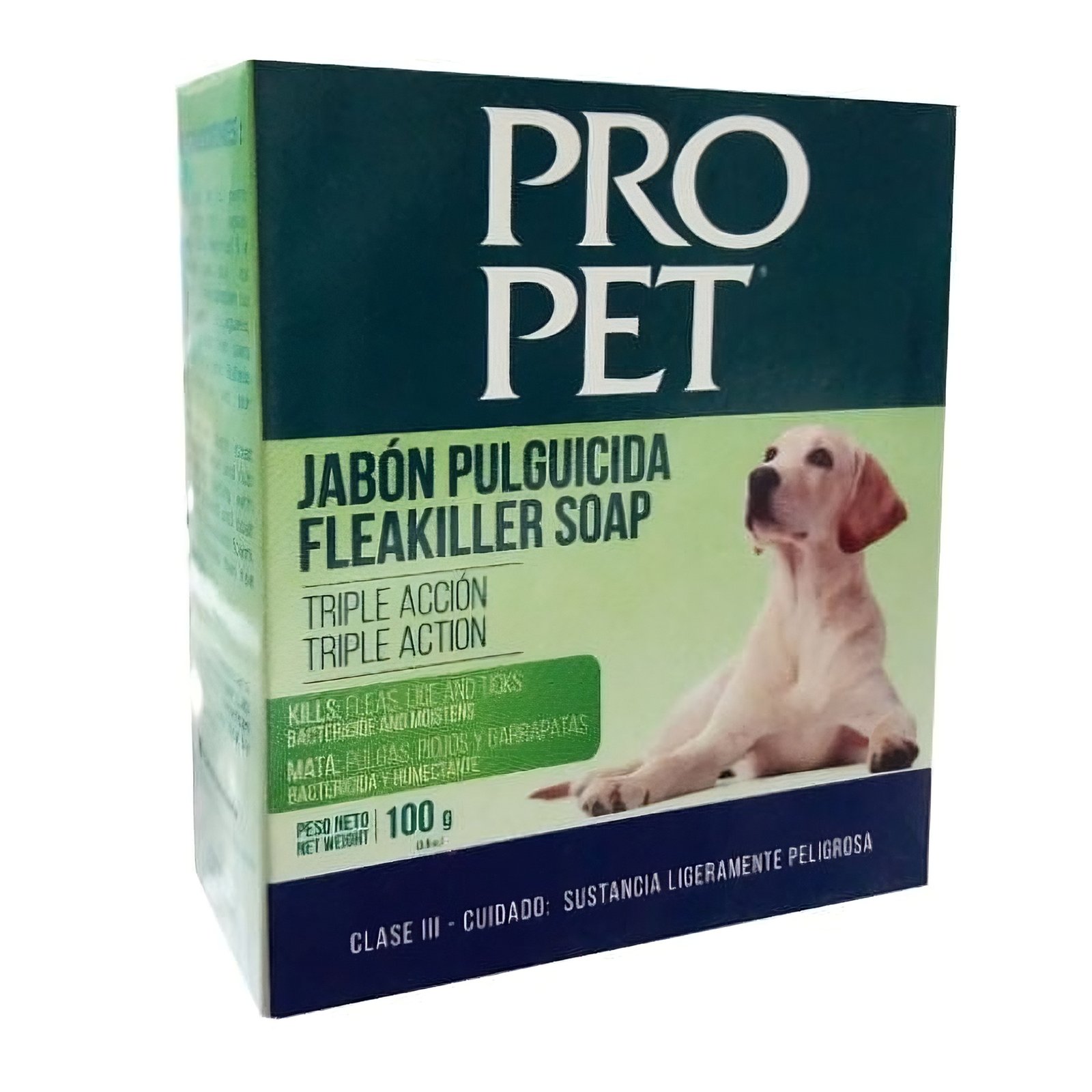 El Jabón Pro Pet Pulguicida Triple Acción para Perro es un producto eficaz para eliminar pulgas, prevenir su reaparición y mantener la higiene del pelaje de tu mascota. Mantén a tu perro libre de pulgas y cómodo con este jabón de calidad.